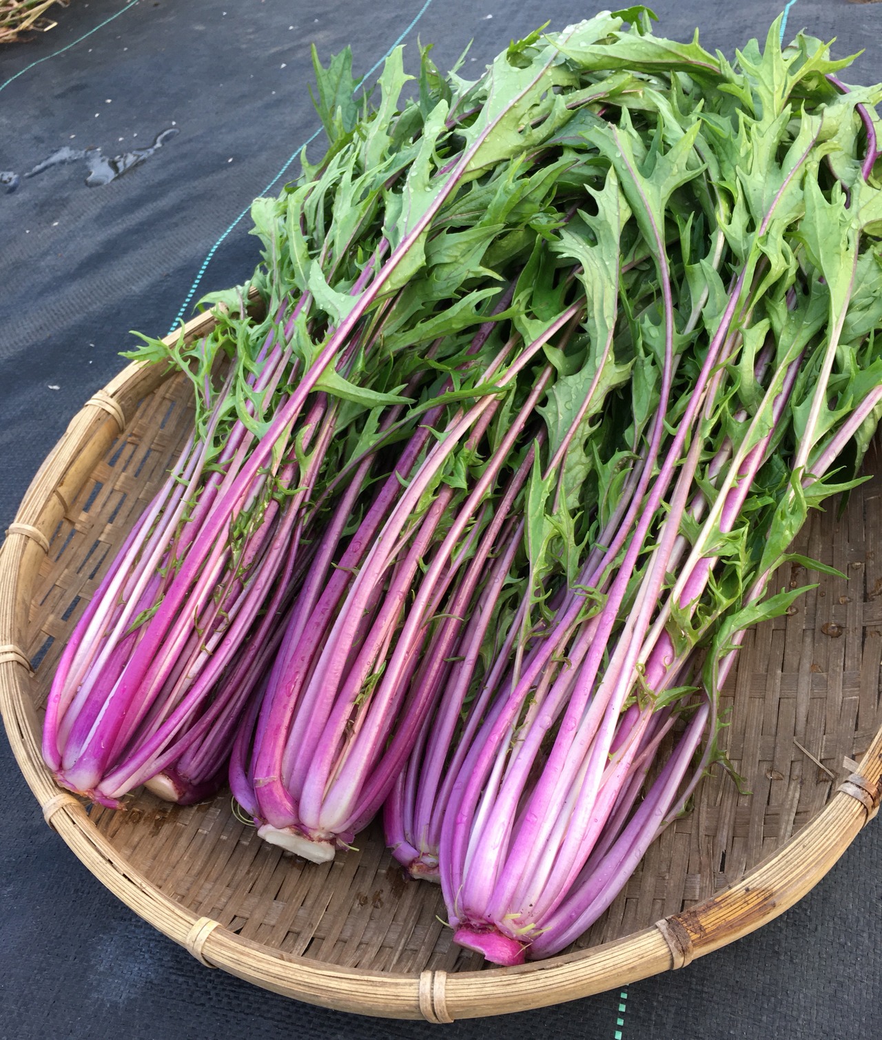 鮮やかな赤紫色の水菜です。サッと茹でれば色落ちもそれほどしません。シャキシャキした食感と共に食卓を彩ります。
